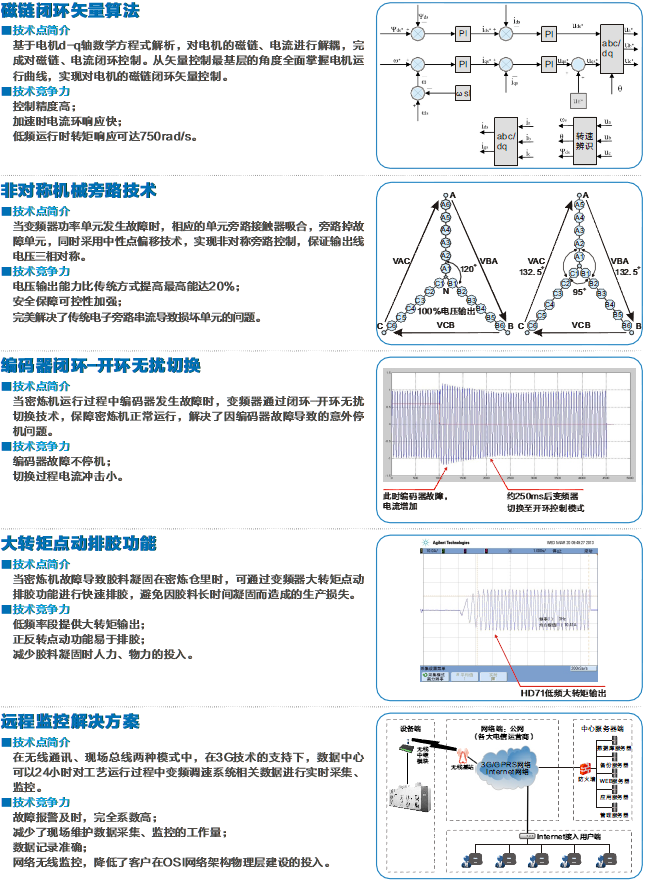 匯川技術(shù)致力于高性能高壓變頻器的探索,秉承對行業(yè)工藝的深入理解和對技術(shù)的極致追求,我們?yōu)橄鹉z行業(yè)帶來了全新的HD71密煉機專用高壓變頻器。HD71具備磁鏈閉環(huán)矢量算法、非對稱機械旁路技術(shù)、編碼器閉環(huán)-開環(huán)無擾切換、大轉(zhuǎn)矩點動排膠功能、遠程監(jiān)控解決方案等優(yōu)點,提高密煉機生產(chǎn)效率的同時降低能耗。大型傳動先鋒,共享卓越性能。